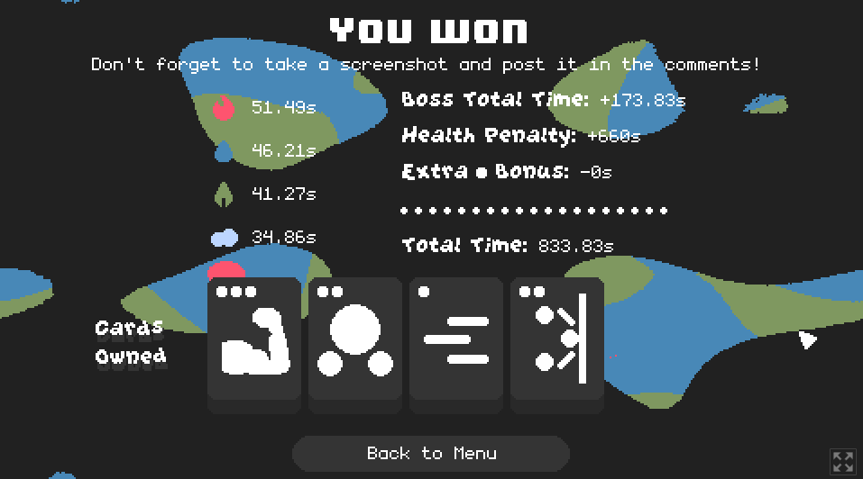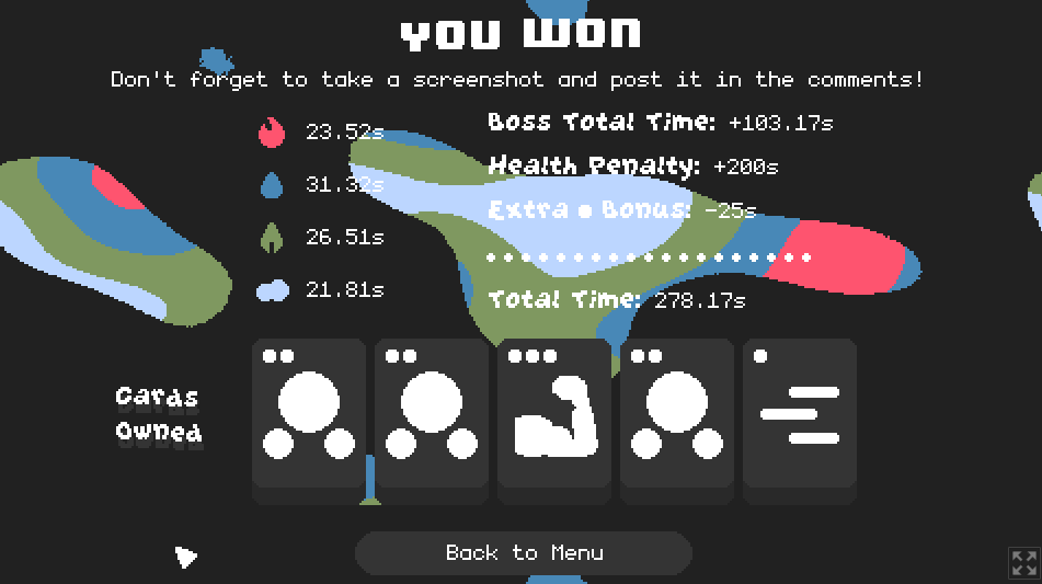 Use upgrades to defeat four unique bosses, each corresponding to an element of nature. after each boss is defeated you can exchange your upgrades for better upgrades. Every upgrade has a cost, and you must exchange upgrades of the same cost.